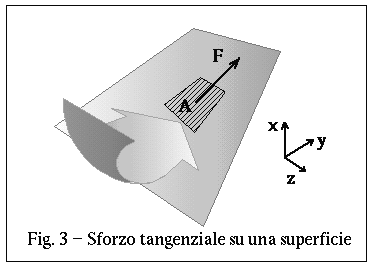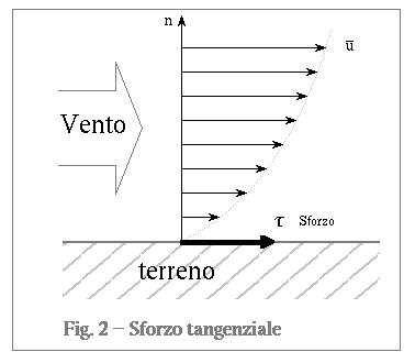 Il vento è di fatto un fluido, la sua velocità decresce in altezza poichè esso è come se tentasse di portare con se in terreno; opera cioè sul piano una forza che implica un certo impiego di energia, rallentando così il flusso del vento. Tale flusso appare ora come a fogli, o meglio, di tipo laminare. E' semplice il calcolo di questa forza, se infatti supponiamo di isolare una piccola zona di terreno A, possiamo definire lo sforzo di taglio (fig.3).