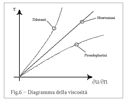 Da qui il calcolo della viscosità è semplice. Sono diversi i tipi di fluidi, si tende cioè a classificare i tipi di fluido secondo la legge di Newton. Sono fluidi newtoniani quelli descritti da una legge lineare, sono invece detti fluidi dilatanti quelli aventi caratteristica non necessariamente passante per l'origine ma superiore alla mediana di Newton, mentre infine sono pseudoplastici i materiali la cui caratteristica è inferiore alla curva di Newton. (fig.6)