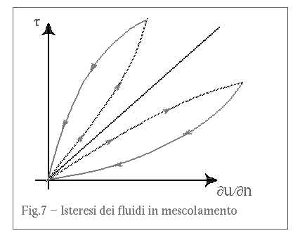 I fluidi non Newtoniani sono caratterizzati, in caso di mescolamento con ulteriori materiali, da un comportamento ad isteresi, cioè la curva tende a seguire un cammino di ritorno diverso dalla prima curva caratteristica (fig.7).