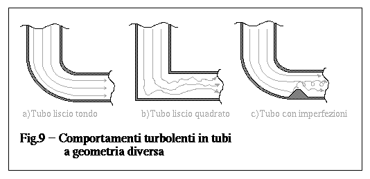 Calcolando quindi il numero di Reynolds per ogni fluido in moto, si può prevedere quando esso cominci a diventare turbolento (valori tra 2300 e 4000), quindi prevenire il fenomeno. La turbolenza provoca di fatto un notevole rallentamento del flusso con ovvi disagi in sede di dimensionamento di impianti che prevedono moto di fluidi. Parallelamente un fluido turbolento ha una notevole capacità di trasporto di calore, esso infatti si distribuisce in buona approssimazione uniformemente nel fluido permettendo quindi un facile trasporto (utilissimo negli impianti di riscaldamento), cosa che non succede in regime laminare dove il nucleo del flusso riceve per ultimo il calore indotto. Importanti sono anche le condutture (fig.9):