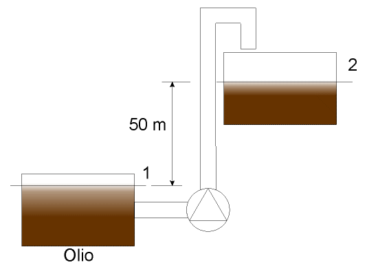 Si intende far fluire dell'olio per motori da una bacinella ad un'altra posta a 50 metri di altezza rispetto alla precedente. Per realizzare questo sistema si usa un tubo di diametro interno di 100 millimetri e di lunghezza 1 chilometro. La portata richiesta in volume è di 20 litri al secondo. Sono richieste la Potenza e la Prevalenza relative alla pompa.