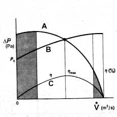 Grafico portata-prevalenza di una pompa (A), rendimento (C),