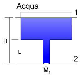 Calcolare la velocità di uscita dell'acqua dal serbatoio in figura e la sua portata in massa.